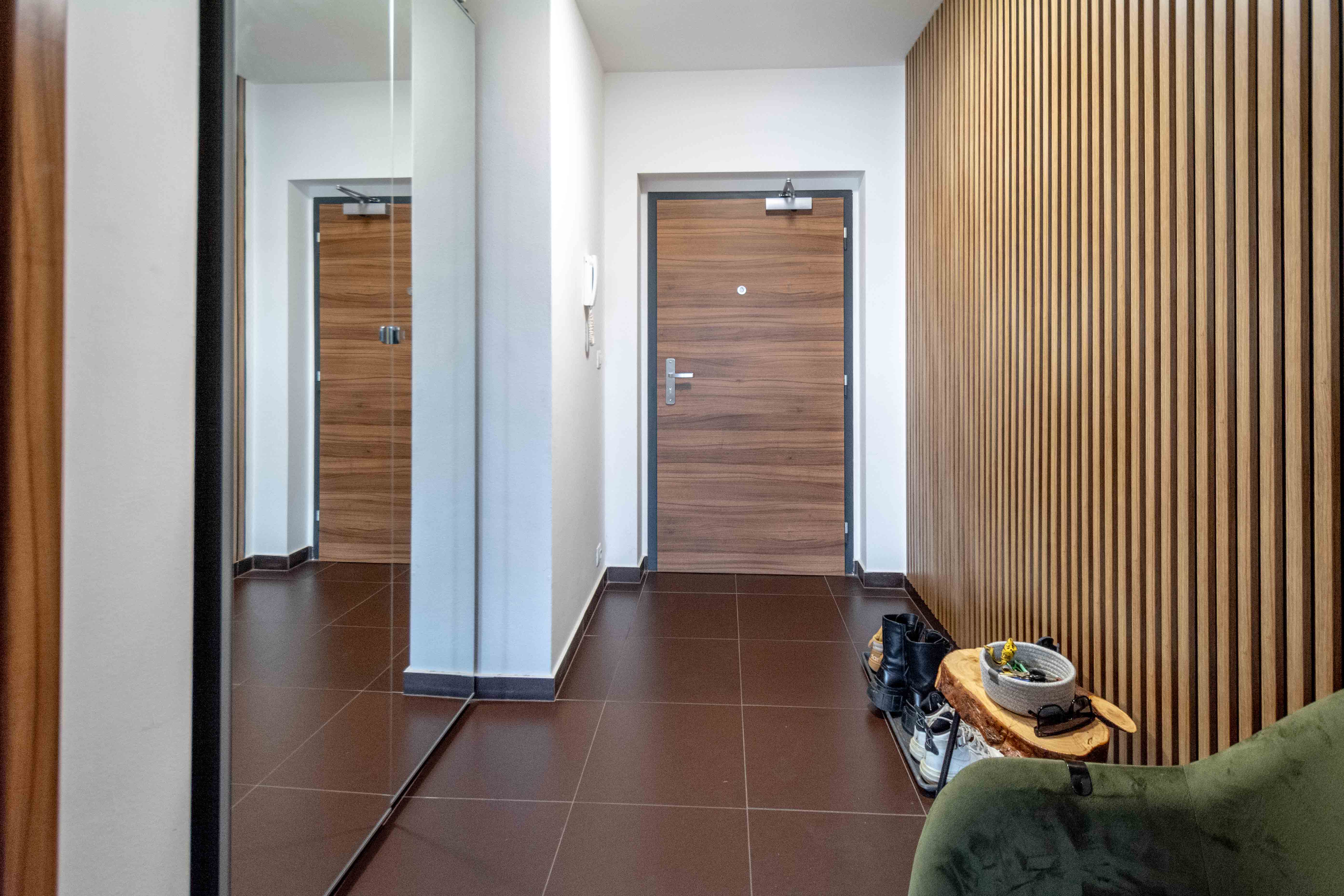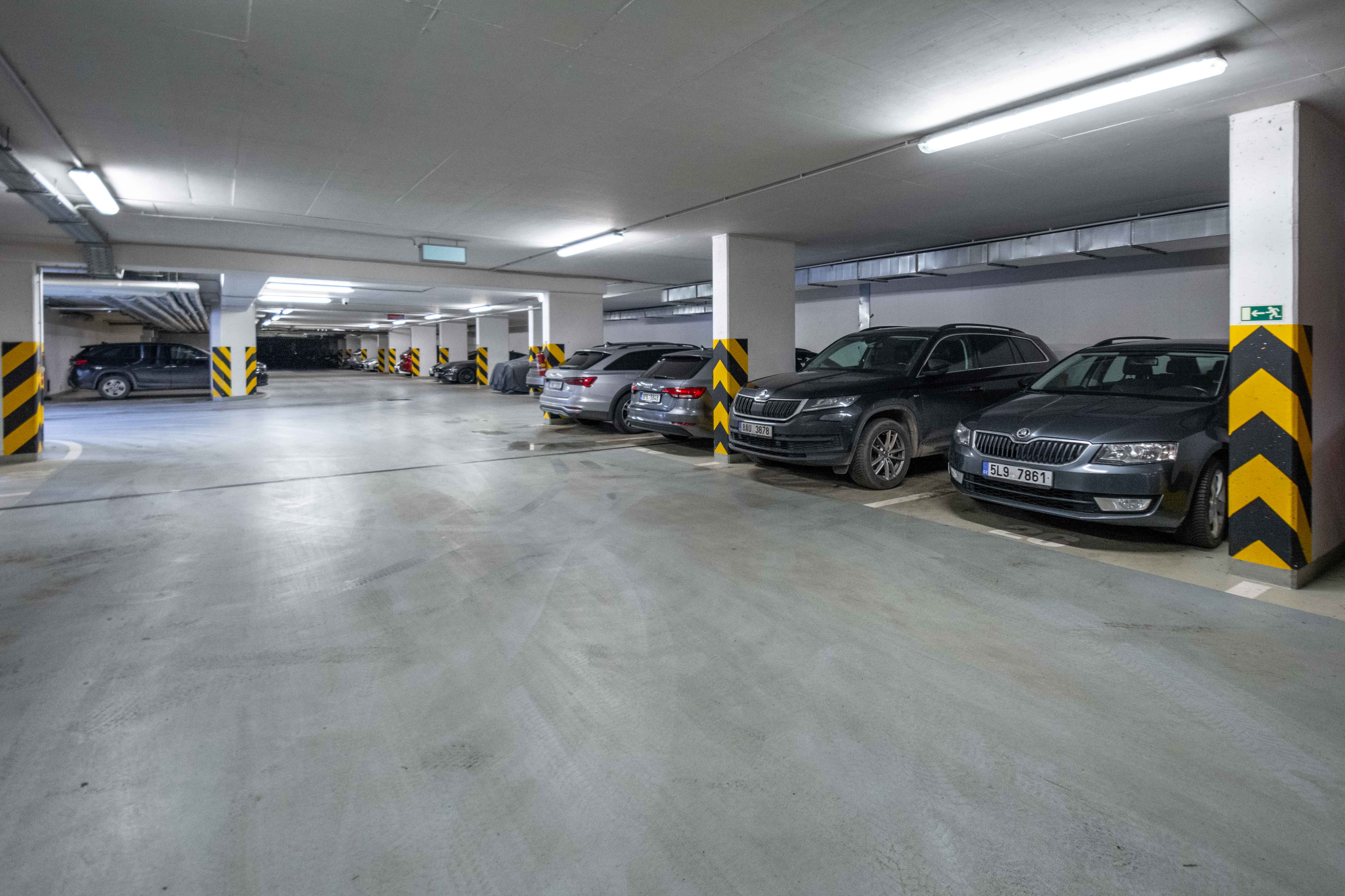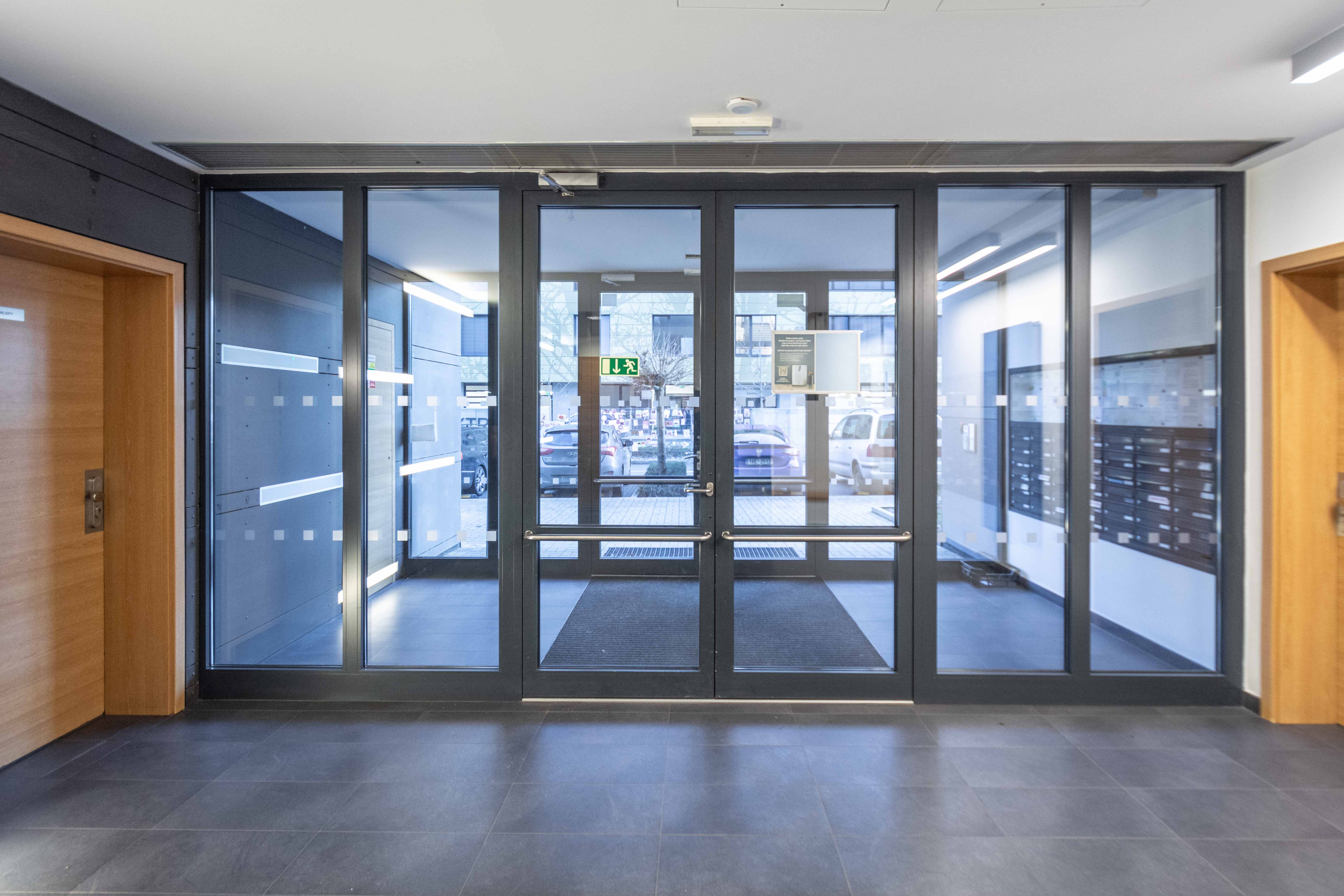 Byt ve 4. patře má dispozici: vstupní chodba, samostatné WC, obývací pokoj spojený s kuchyňským koutem a vstupem na balkon, ložnice se šatnou, koupelna s vanou a WC. K bytu patří sklepní kóje a vnitřní parkovací místo.